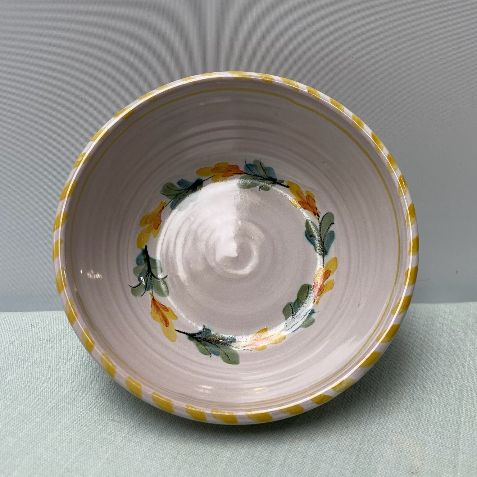 A small bowl thrown on the wheel and decorated with a loose floral spray in soft greens and yellow with a yellow pattern around the rim.