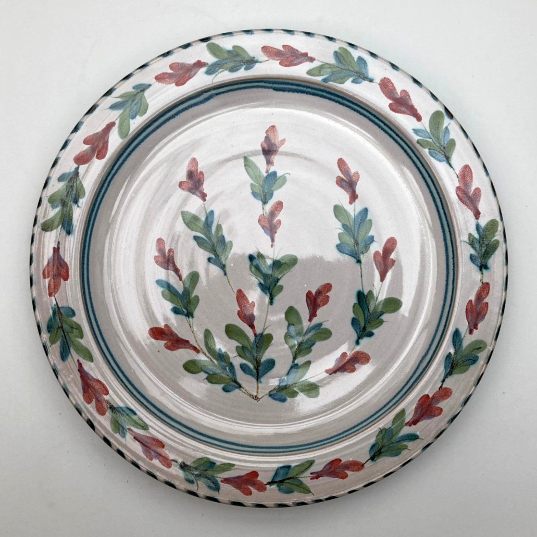 A dinner plate in my fuchsia pattern, hand painted with flowing leaves and small floral details in blue and green, and finished with a softly banded edge.