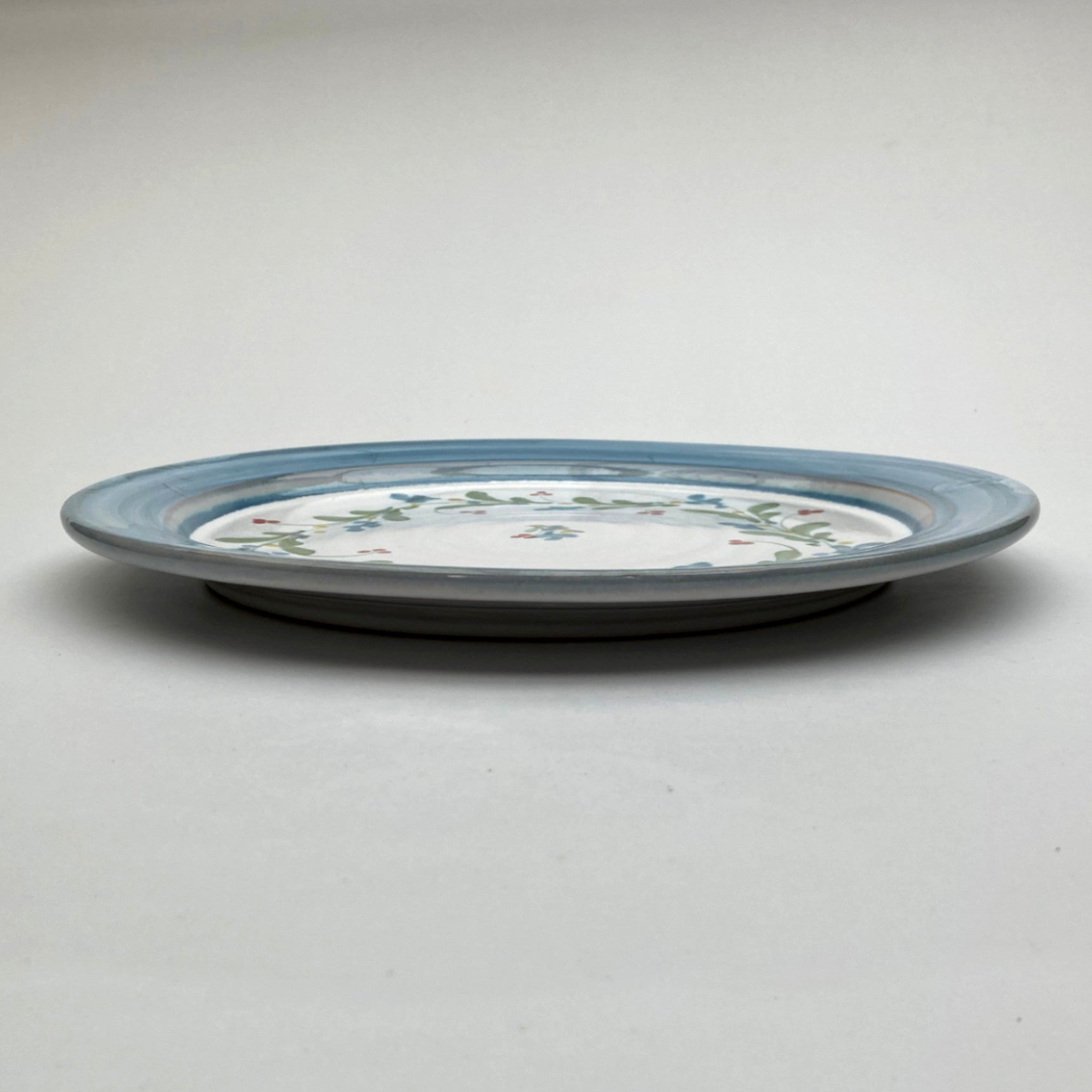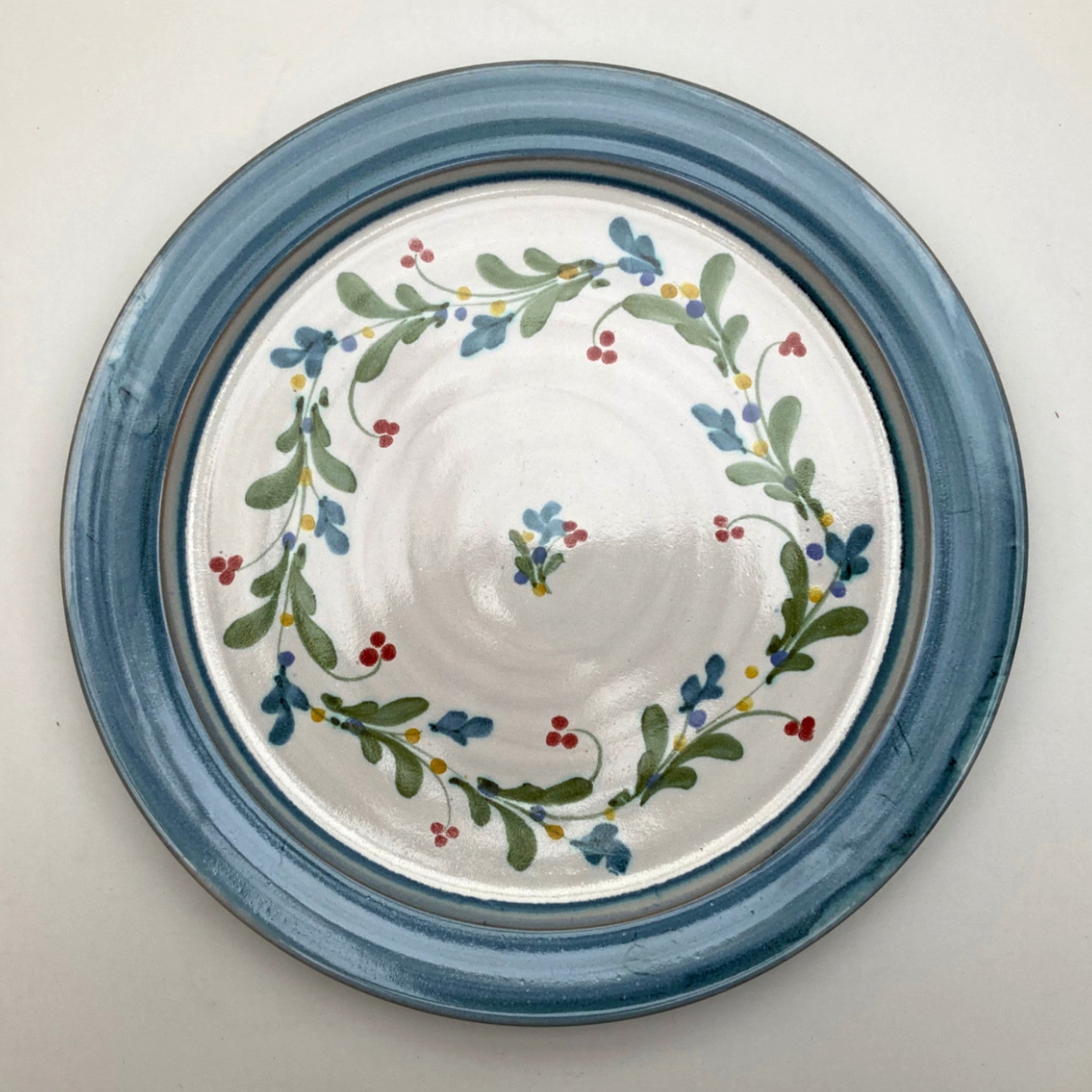 A dinner plate in my mistletoe pattern, painted in blue-green tones with small lime accents and finished with a softly banded edge.