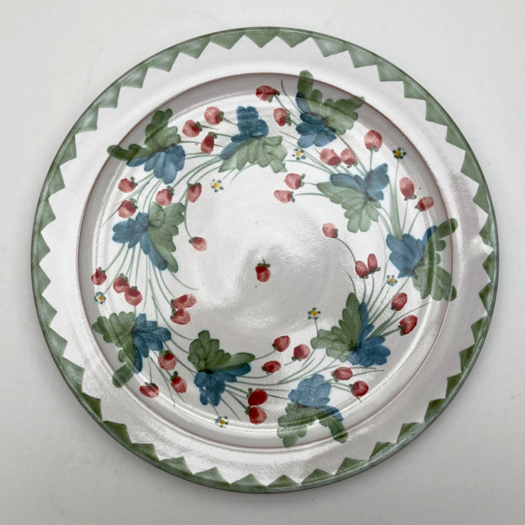A dinner plate in my strawberry pattern, painted with soft green leaves and small red fruits winding gently around the centre, and finished with a scalloped edge.