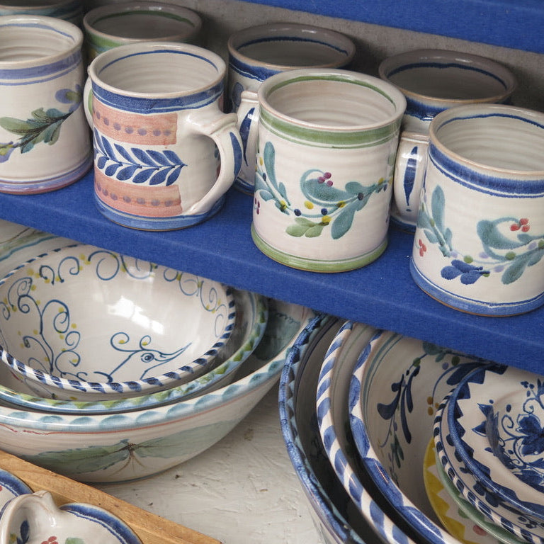 I make each piece in the spirit of traditional Majolica, using time-honoured methods and materials that give the pottery its soft texture and quietly vivid colour.